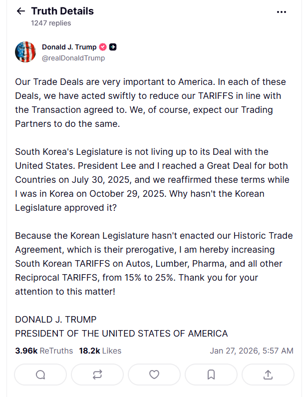 特朗普表示,鉴于韩国方面尚未通过该项“具有历史意义的贸易协议”,他已决定将对韩国汽车、木材、制药产品以及其他对等关税项目的税率从15%上调至25%。
