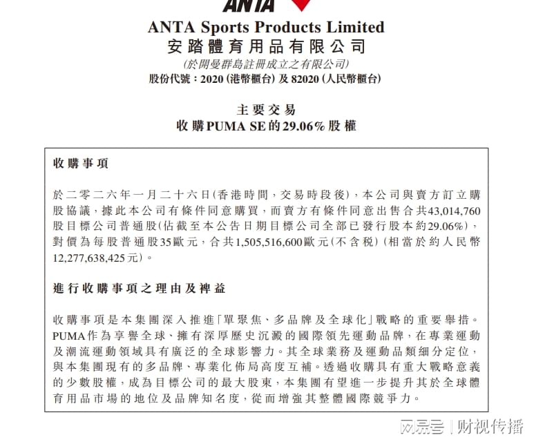 1月27日,安踏体育用品有限公司宣布,已与 Pinault 家族旗下投资公司 Groupe Artémis 达成购股协议,将以15亿欧元现金收购全球知名运动品牌彪马(PUMA)母公司 PUMA SE 29.06% 的股权。交易完成后,安踏将成为彪马的最大单一股东。本次收购资金全部来自安踏集团自有现金储备。