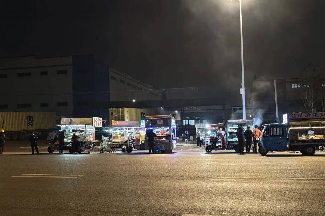 比亚迪厂区门口,人群熙攘,各式小吃餐车有序排开,不少摊主甚至摆出了简易桌椅,方便工人即刻就餐,烟火气十足。