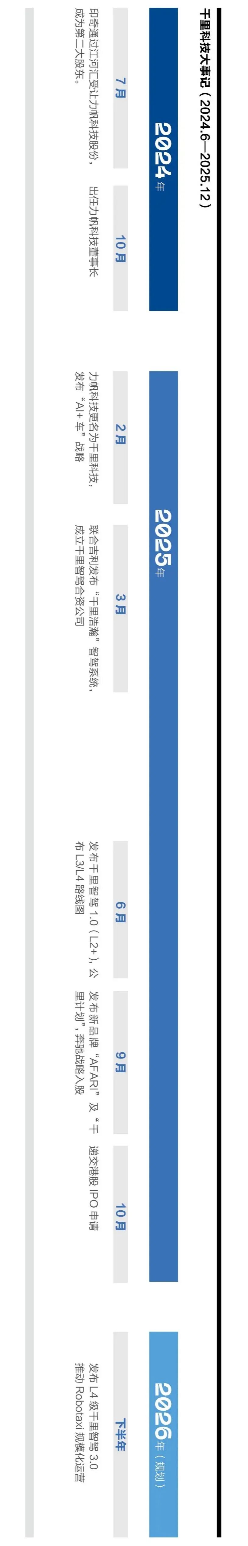 无数个大小决策下,团队几乎每天都在抢时间,严格打表。一个18个月构建三大AI解决方案的具体规划,精准聚焦三条业务线:1.千里智驾(L2+—L4级智驾方案);2.千里智舱(自然交互座舱体验);3.千里智行(Robotaxi)加快完成全链路产业布局。