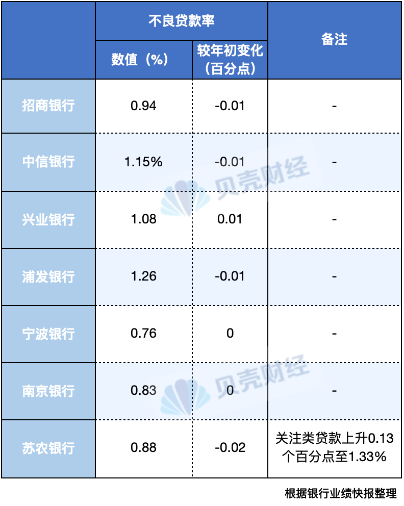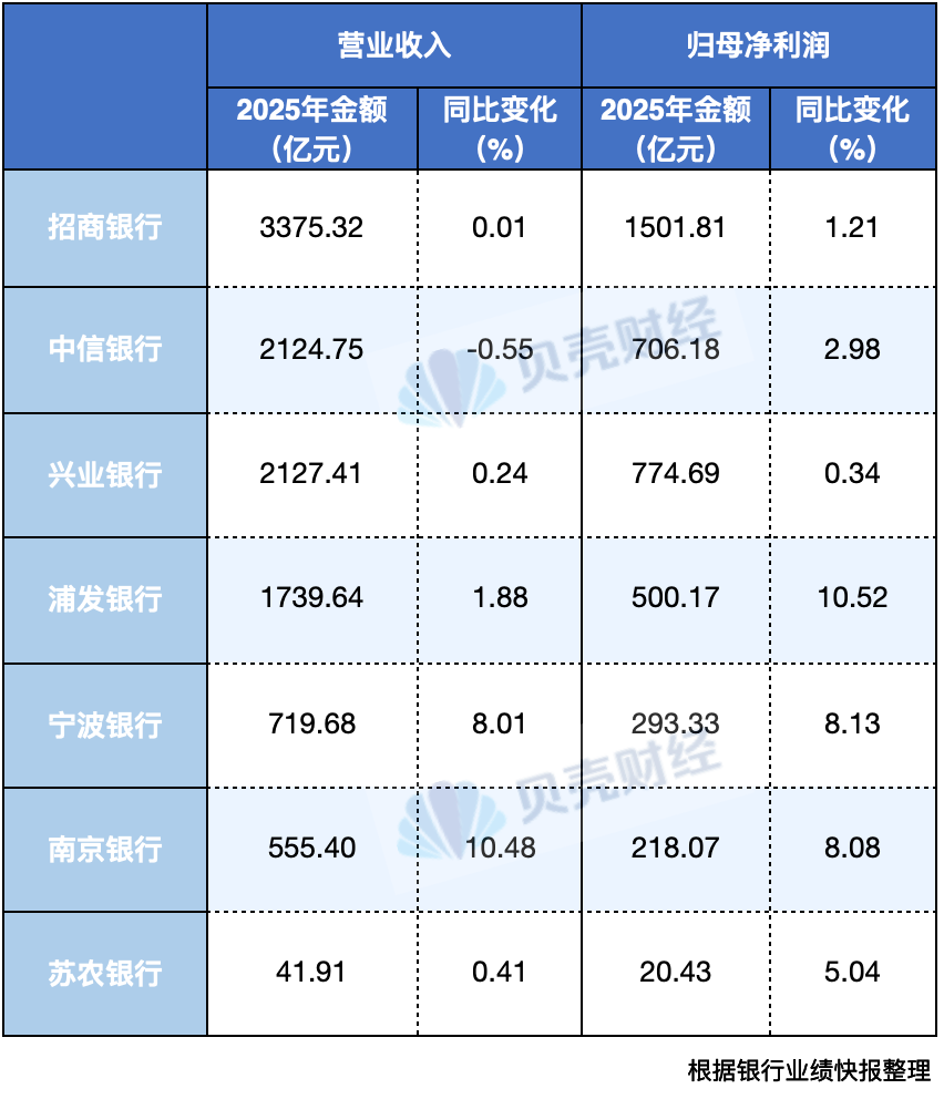 据贝壳财经记者不完全统计,目前已有招商银行、兴业银行、中信银行、浦发银行、宁波银行、南京银行和苏农银行共计7家银行发布了2025年业绩快报。