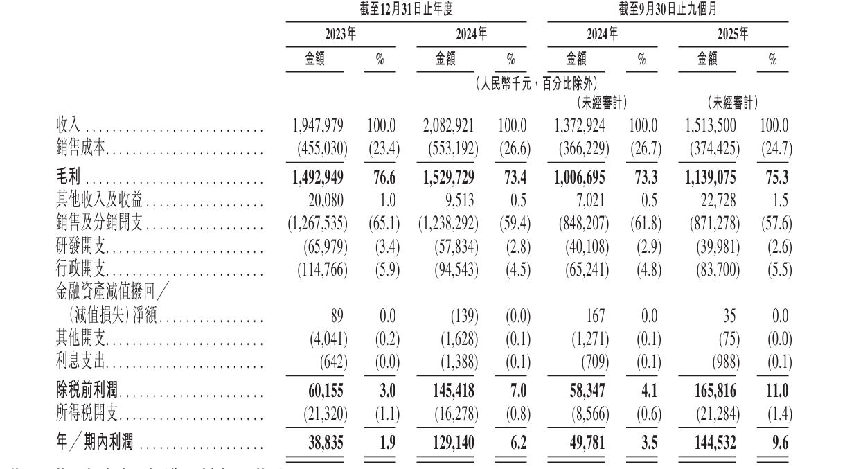 在销售及分销开支上,2023年、2024年HBN分别为12.67亿元、12.38亿元,占总收入比例达65.1%及59.4%,其中推广开支2023年为11.14亿元,占比87.9%,2024年为10.49亿元,占比84.7%。截至2024年及2025年前9个月,销售及分销开支分别为8.48亿元、8.71亿元,占总收入比例分别为61.8%及57.6%,同期推广开支分别为7.21亿元、7.20亿元,占比84.9%、82.6%。