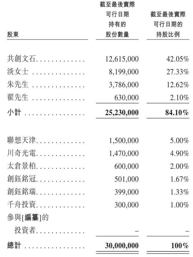 控股股东淡玉婷、朱增、翟永泰及股权激励平台共创文石合计持股84.1%(淡玉婷通过公司股权激励平台共创文石直接及间接控制公司全部表决权的69.38%)。联想天津持股为5%,川奇光电持股为4.9%,太仓景柏持股为2%,创钰铭冠持股为1.67%,创钰铭瑞持股为1.33%,千舟投资持股为1%。