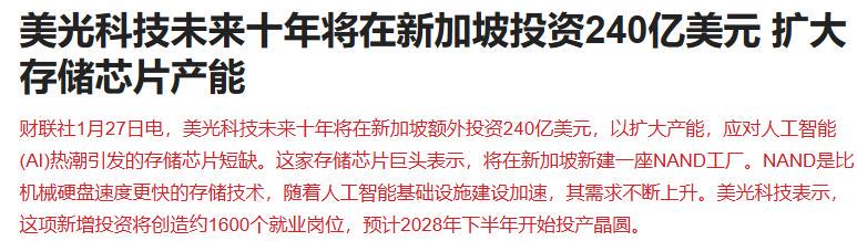 美光科技未来十年将在新加坡额外投资240亿美元,以扩大产能,应对人工智能(AI)热潮引发的存储芯片短缺。这家存储芯片巨头表示,将在新加坡新建一座NAND工厂。