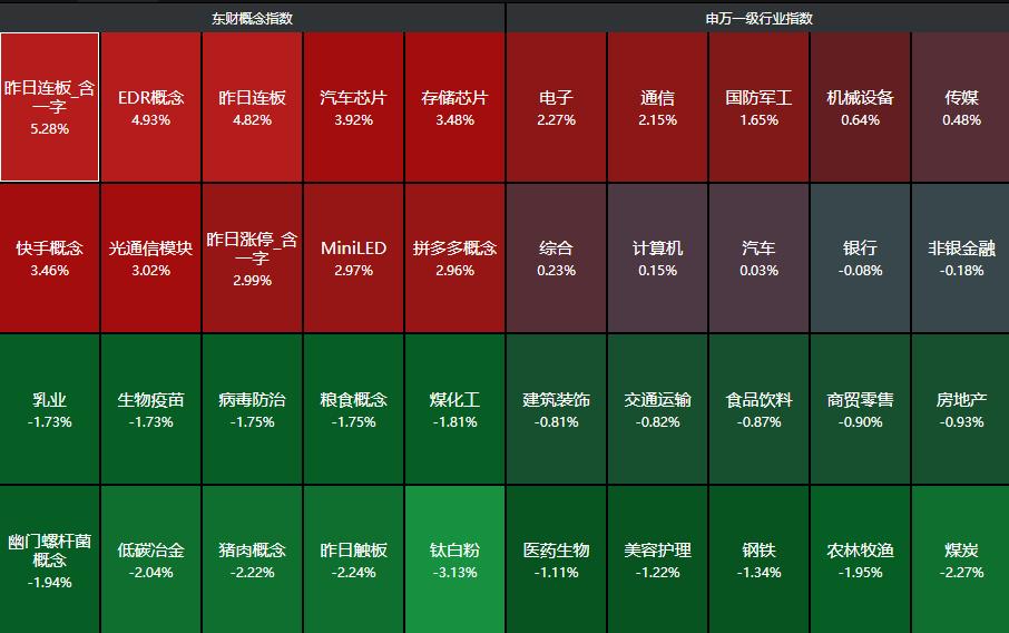 分行业来看,电子、通信、国防军工、机械设备等行业领涨,煤炭、农林牧渔、钢铁等行业领跌。