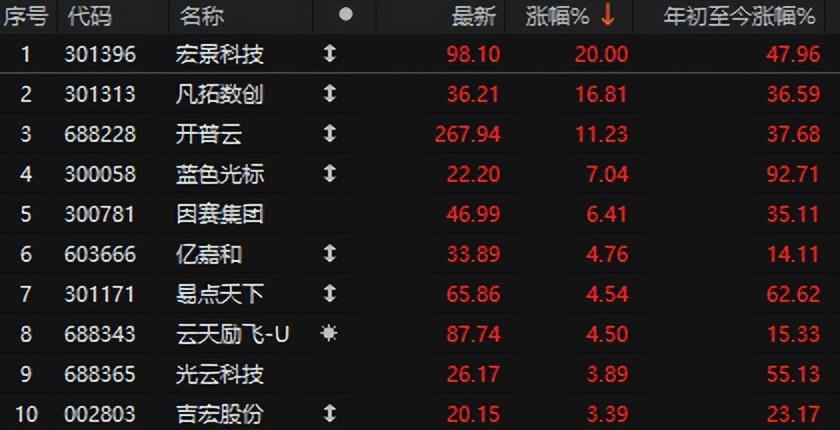 今天港股minimax暴涨超26%,A股ai应用和算力大涨,宏景科技涨停,蓝色光标涨超7%。