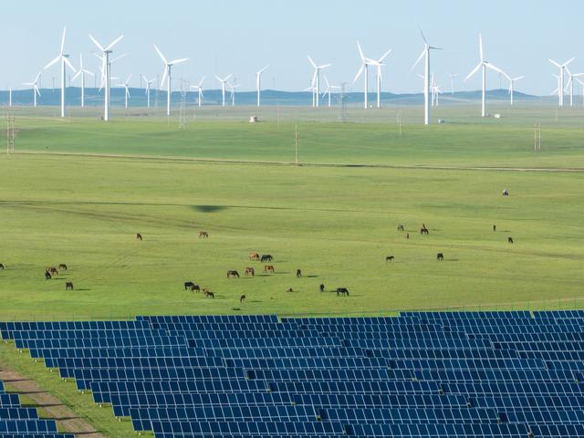 航拍内蒙乌兰察布辉腾锡勒草原上的太阳能发电站和风力发电机。图片来源:视觉中国