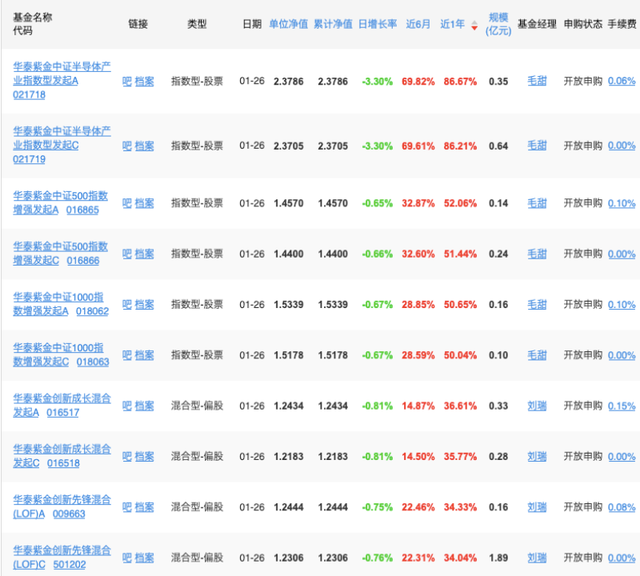 不过,从单个产品来看,表现出色的也都是指数型或股票型基金,截至1月26日,近一年来,华泰资管旗下共有10只产品收益率超过30%(A/C份额分开统计),其中华泰紫金中证半导体产业指数型发起A、C涨幅超过80%。