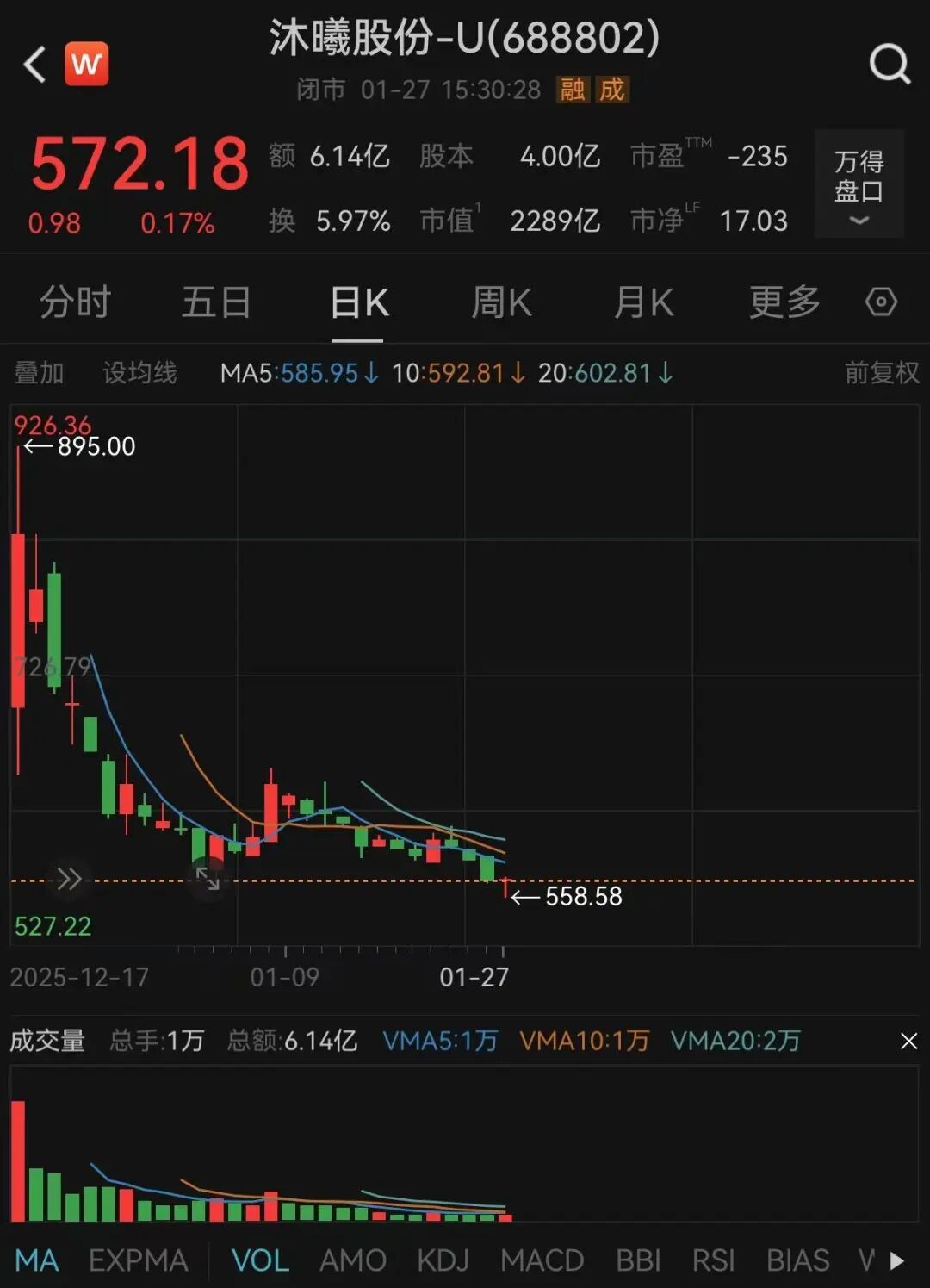 截至今日收盘, 沐曦股份涨0.17%,报572.18元。该股自上市以来累计跌超18%。