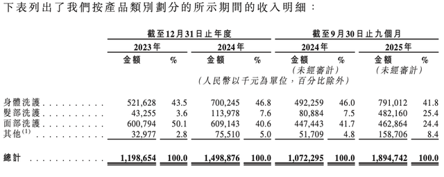 作为压舱石的身体洗护品类,2023-2025年前三季度分别实现营收 5.22亿元、7亿元、7.91亿元,占比始终稳定在40%以上,分别为 43.5%、46.8%、41.8%,