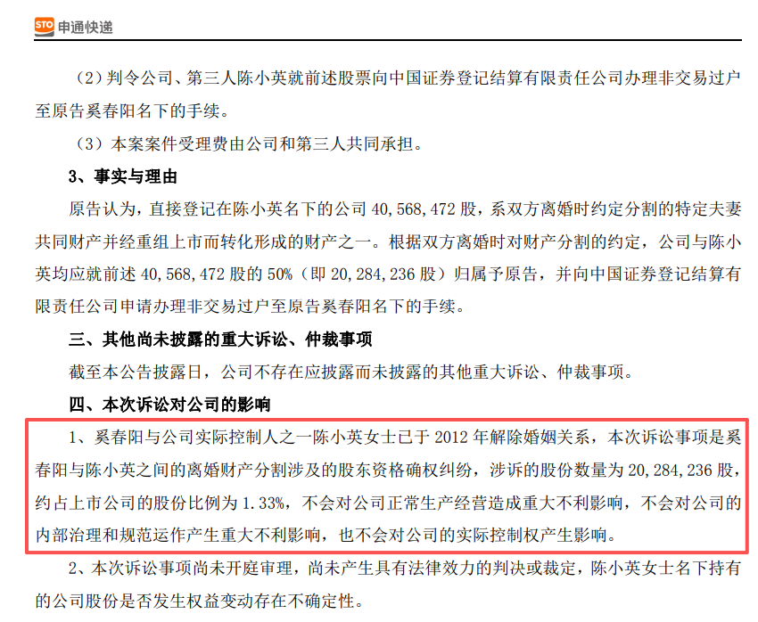 申通快递在公告中表示,涉诉股份约占上市公司总股本的1.33%,本次诉讼事项对上市公司损益无直接影响,不会对公司正常生产经营造成重大不利影响,也不会对公司的实际控制权产生影响。本次诉讼事项尚未开庭审理,尚未产生具有法律效力的判决或裁定,陈小英女士名下持有的公司股份是否发生权益变动存在不确定性。