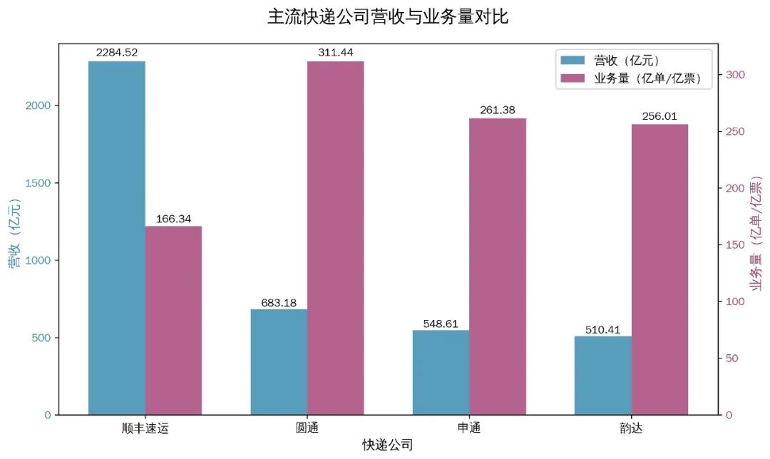 就2025年全年数据来看,顺丰速运物流业务收入达到2284.52亿元,全年完成业务量166.34亿票;圆通实现营收683.18亿元,完成业务量311.44亿单;申通实现营收548.61亿元,完成业务量261.38亿单;韵达实现营收510.41亿元,完成业务量256.01亿单。