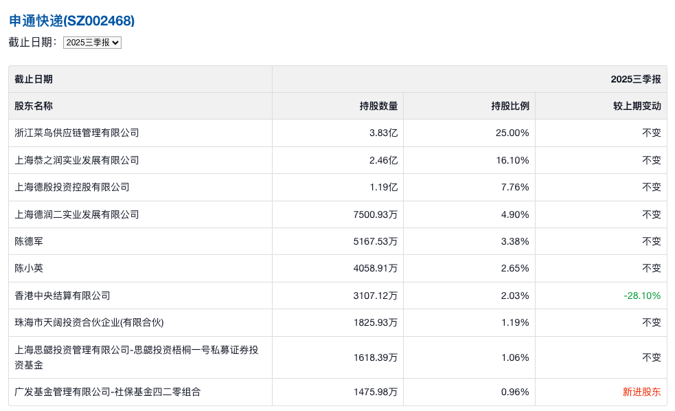 ▲申通快递十大股东,图源:雪球截图