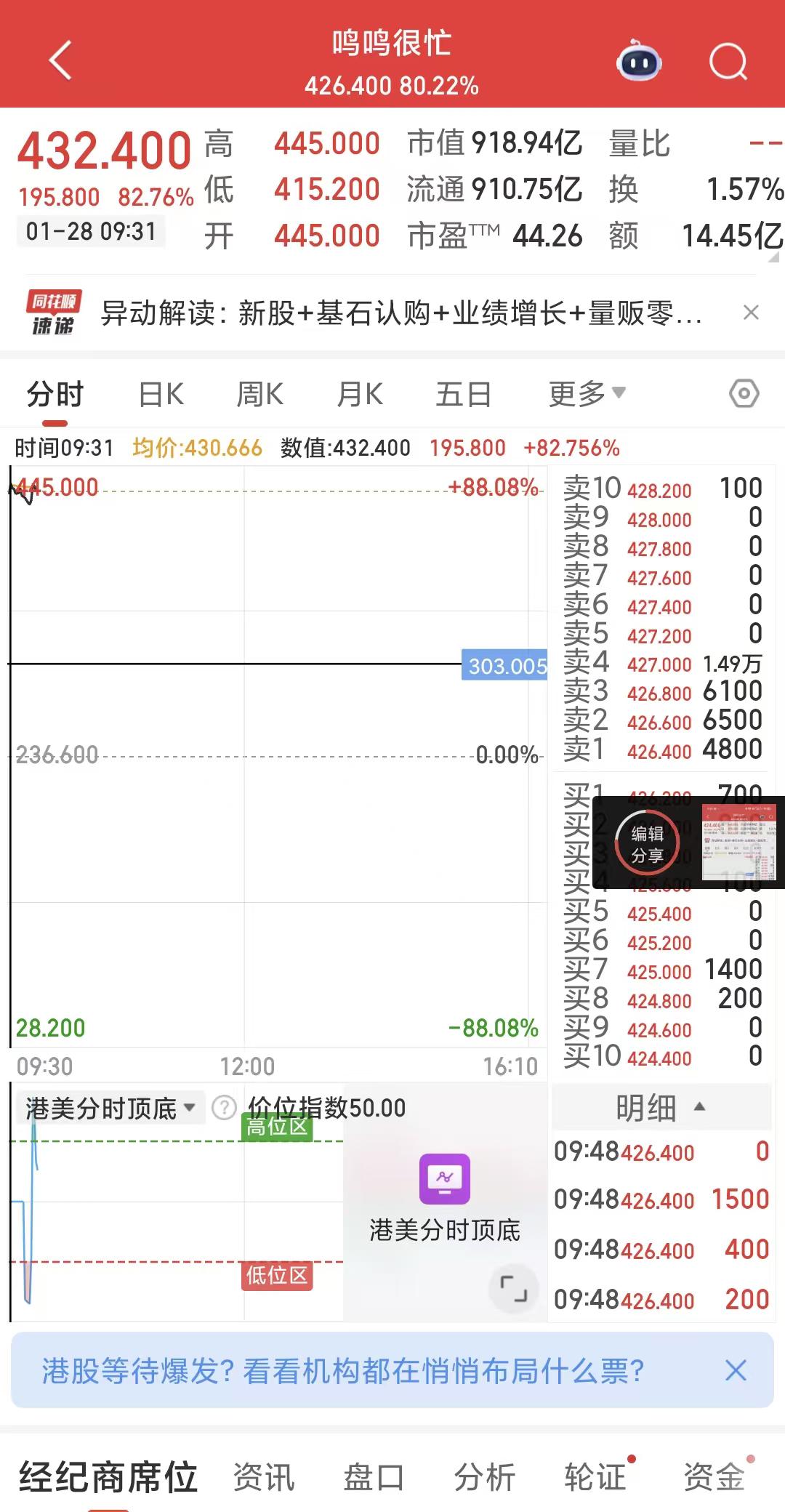 1月28日,鸣鸣很忙在港交所上市,开盘大涨82.76%,报432.4港元/股,截至发稿前股价有所回落,报427港元/股,市值920.23亿港元。