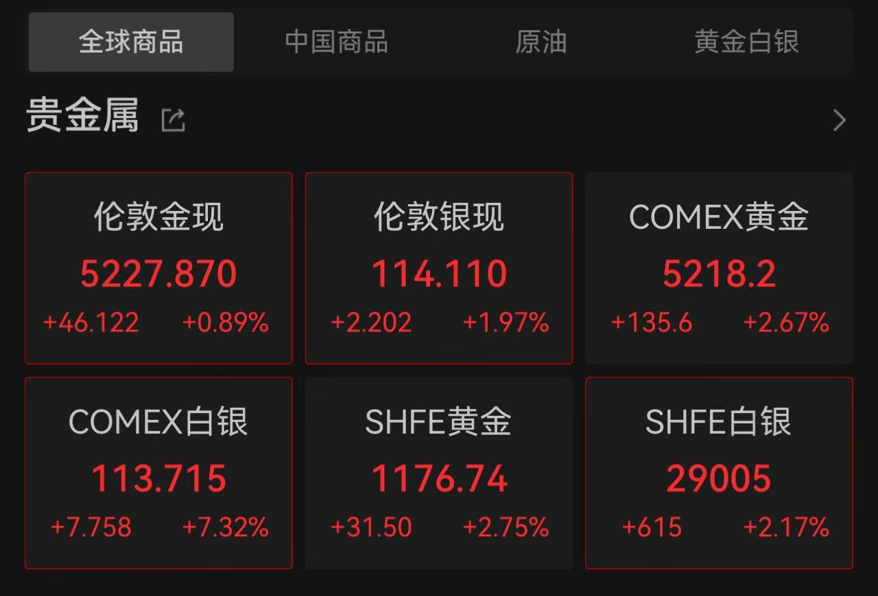 红星资本局1月28日消息,今日早盘,国际金价大幅拉涨,盘中首次站上5200美元,再创历史新高。截至发稿,伦敦金现、COMEX黄金分别报5227.87美元/盎司、5218.2美元/盎司,年内累计涨超20%。