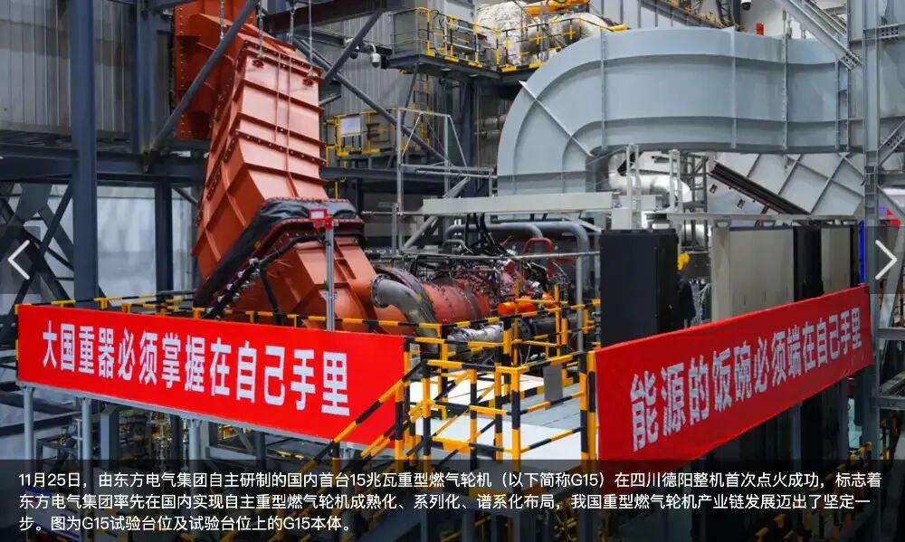 2024年11月,国内首台自主研制F级15MW重型燃气轮机G15在东方电气点火成功,三大核心部件完全国产化。