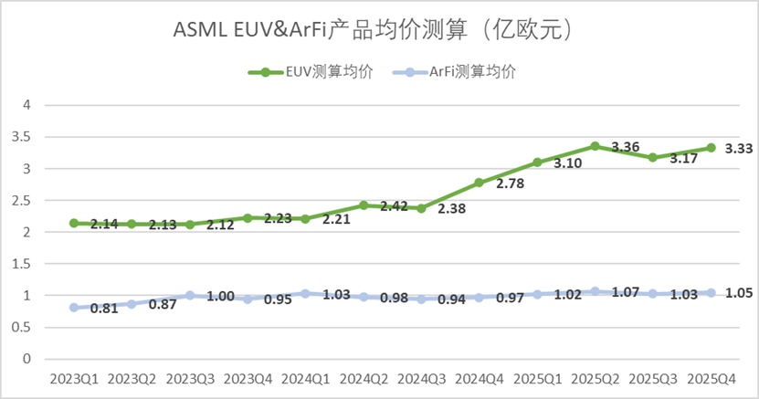 如果以收入结构回推估算,四季度单台EUV均价(含服务)约为3.33亿欧元,环比增长了5%左右,ArFi产品单台均价同样增长了2.1%左右,EUV及ArFi产品均价接近历史最高位。