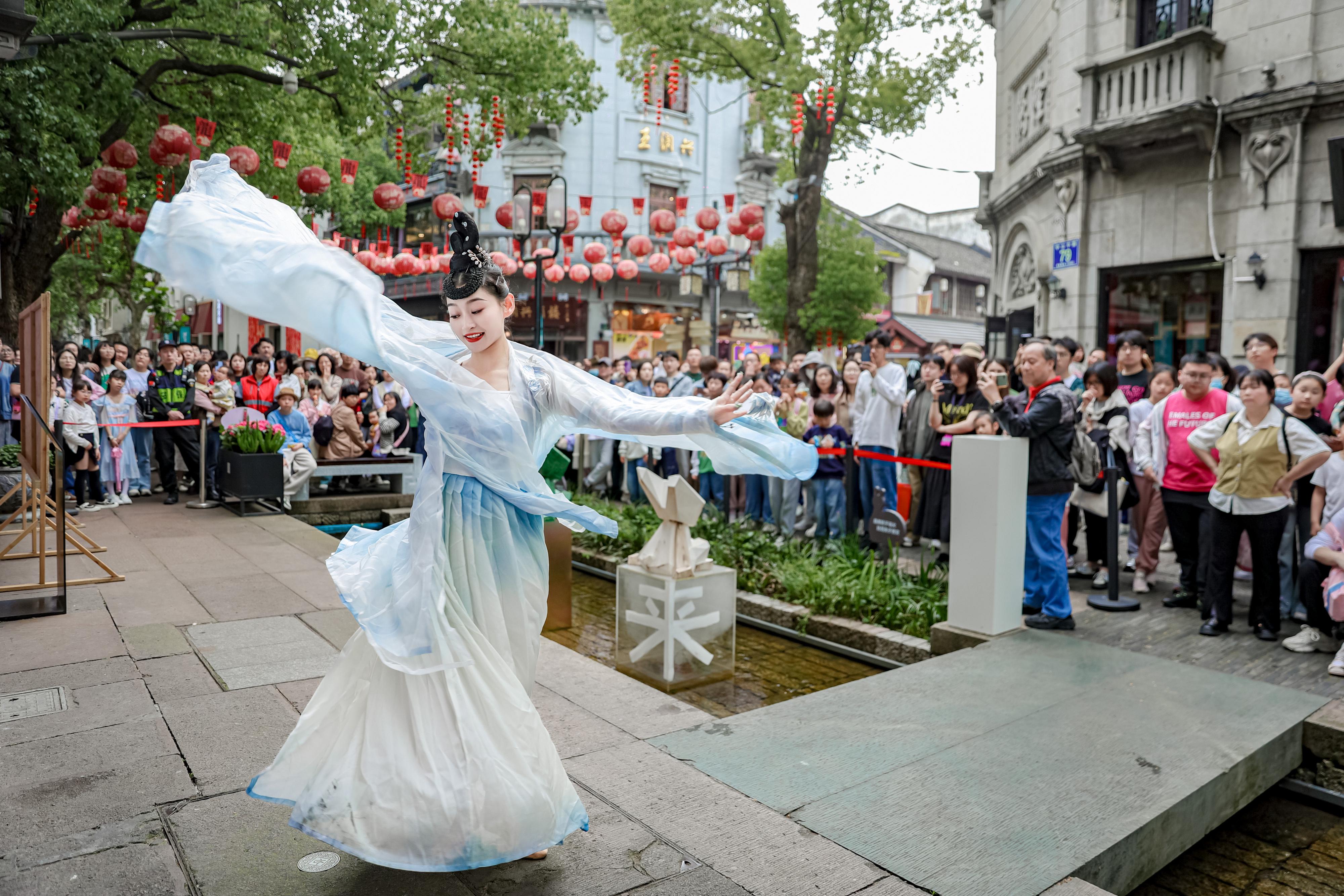 (二)人文为经济铸魂,激发消费活力。依托深厚的历史文化底蕴,以时尚国潮文化为导向,将沉浸式特色IP、非遗民俗融入街区运营,年均推出夏夜漫游季、吴山庙会年货集等文旅活动超百场次。紧扣各类节庆、节点,联动街区商户、品牌IP,策划特色市集、国潮巡游等全域营销活动。加强与国内外艺术院校、博物馆及新锐艺术家的合作,推出秋叶艺术节、“艺把椅子”共创计划等先锋艺术活动,让历史韵味与现代潮流在街区和谐交织。