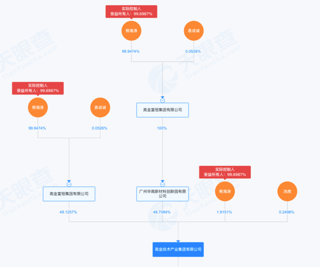 2016年,熊海涛通过一笔6000万的增资一举成为高金技术产业集团有限公司的实控人,持股高达99.7%;天眼查股权穿透图显示,通过高金集团,直接及间接控股上述三家A股上市公司:持有高盟新材28.35%股份、毅昌科技25.25%股份、东材科技22.86%股份,成为三家公司的实际控制人。
