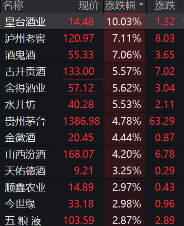 其中,皇台酒业涨停,泸州老窖、酒鬼酒涨超7%,古井贡酒、舍得酒业、水井坊涨超5%,贵州茅台、山西汾酒涨超4%。