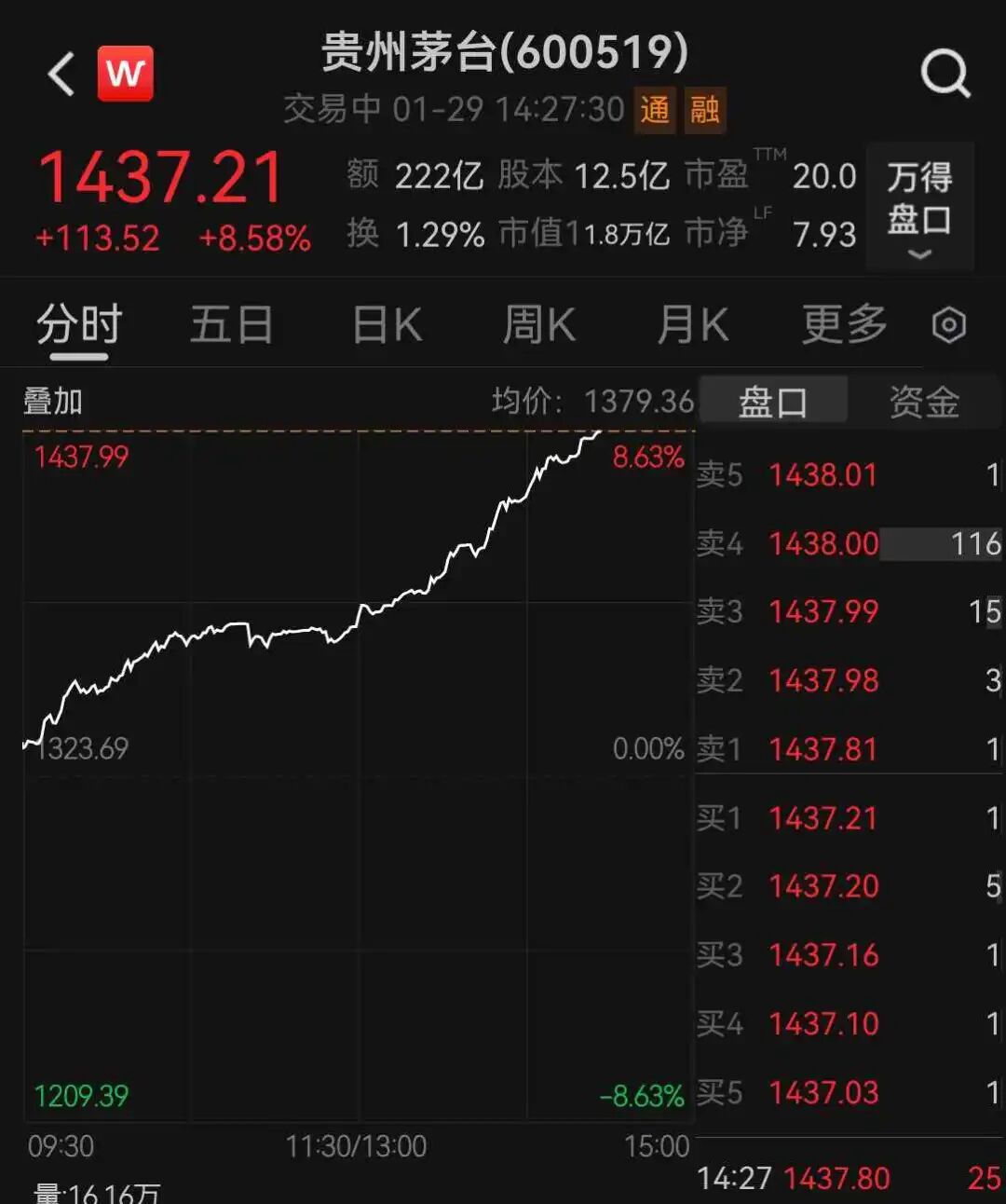 1月29日,贵州茅台股价午后持续走高,重回1400元,截至发稿,涨超8%,报1437.21元,成交额超220亿元。
