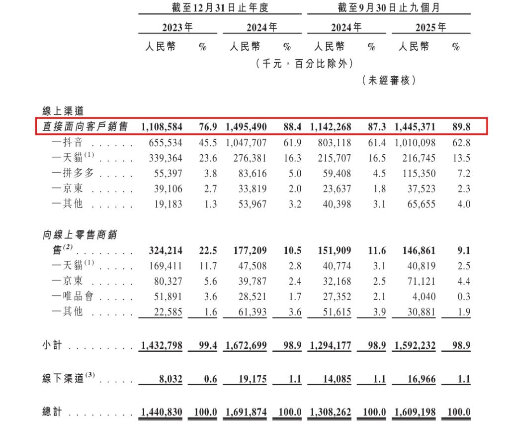 近99%的收入依赖线上直接销售,抖音渠道占比已超60%