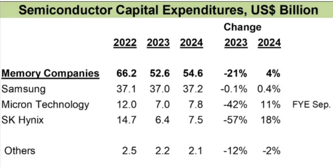 上一轮的强降雨要是泄不掉,就会酿成新一轮的洪水。存储行业乐极生悲,必须吞下集中扩产的恶果,一边为产能过剩发愁,一边断崖式削减资本开支。2023年,全球半导体资本支出总额 1690 亿美元,同比下滑 7%,降幅21%的存储成为重灾区。