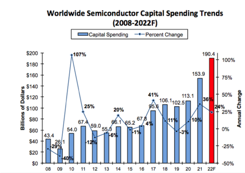 2022年前后,产能焦虑叠加地缘政治带来的供应链安全风险,从大陆到台湾,从美国到韩国,全球半导体产能建设进入“大跃进”阶段。IC Insights 数据显示,2021年半导体资本支出暴涨35%后,2022年再增15%,台积电、三星抛出百亿美元级扩产计划,大陆厂商也也同步加速追赶成熟制程产能。
