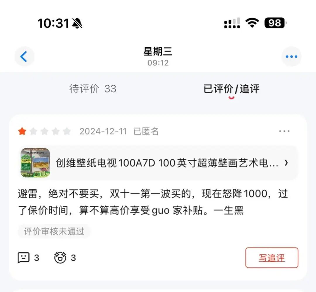 消费者对创维电视的投诉也与日俱增。去年,创维被曝出“先涨价后降价”的营销争议,还有不少用户反映电视屏幕有亮点、售后体验差,整体使用感受与品牌昔日口碑相去甚远。