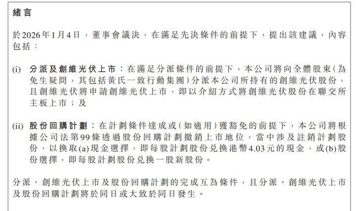 与此同时,创维集团将推进私有化退市。创维也给原股东提供了两种选择:一是按4.03港元/股的价格进行现金回购;二是“一股换一股”,将创维集团的股票换成创维光伏。