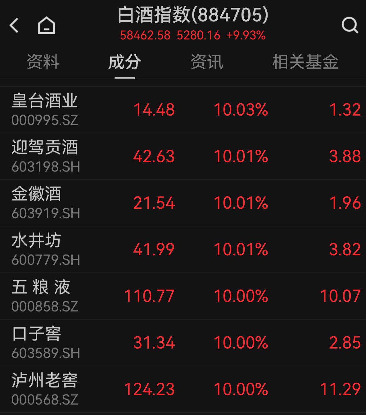 泸州老窖、珍酒李渡、金种子酒、皇台酒业、金徽酒、水井坊、酒鬼酒、舍得酒业等10股纷纷直奔涨停,会稽山、古越龙山两黄酒品种也双双涨停;