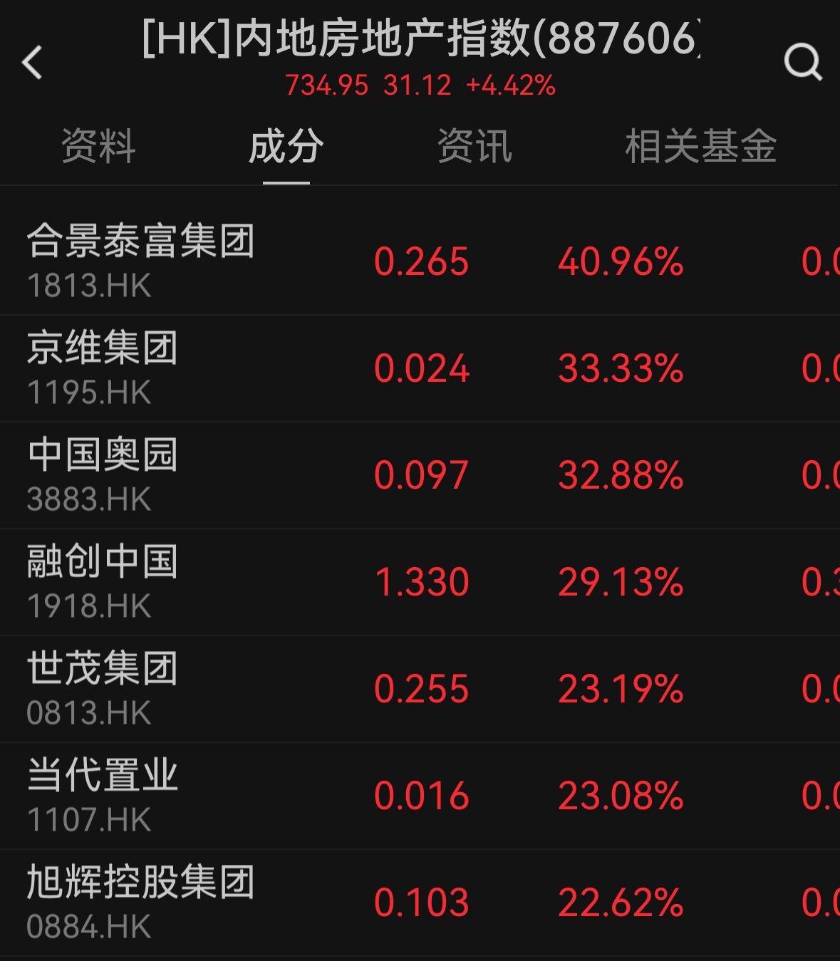 港股方面,内房股涨幅更为凌厉,融创中国涨超20%,中国奥园飙升32%,板块整体大涨超4%。