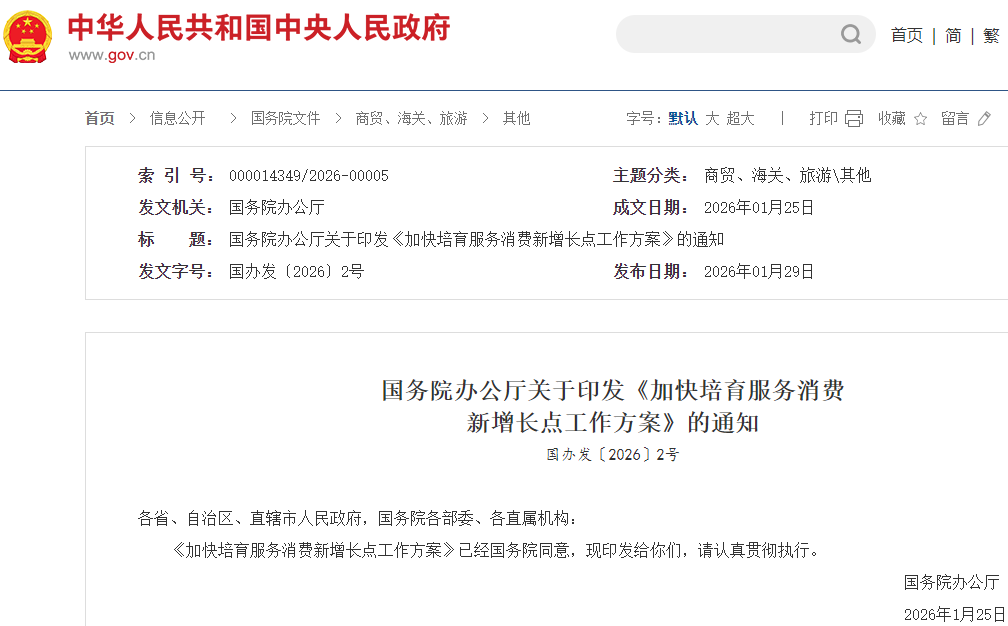 红星资本局1月29日消息,为优化和扩大服务供给,聚焦重点领域、潜力领域,加快培育服务消费新增长点,促进服务消费提质惠民,国务院办公厅日前印发《加快培育服务消费新增长点工作方案》(以下简称《工作方案》)。