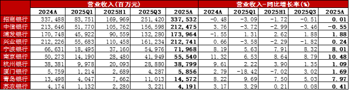 区域行方面,上述10家银行中,含5家城商行与1家农商行。可观的是,该6家营业总收入全部实现上涨,其中,宁波银行营业收入规模最大,2025年营业收入为719.68亿元,营业收入同比增长率排名第二,为8.01%;南京银行营收规模位列第二,营收增速表现亮眼,2025年实现大幅增长10.48%至555.4亿元;杭州银行与青岛银行次之,2025年末分别实现387.99亿元与145.72亿元的营收额,同比增速分别为1.09%与7.97%;厦门银行与苏农银行营收规模未达百亿,且增速相对平缓,厦门银行2025年同比增长1.69%至58.56亿元,苏农银行2025年同比增长0.41%至41.91亿元。