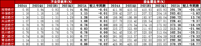 图3:10家上市银行2024A-2025A不良贷款率、拨备覆盖率情况