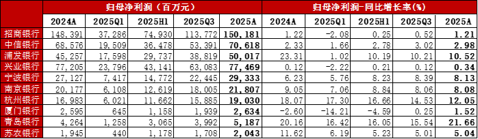 对比6家区域行,3家城商行归母净利润规模超百亿元;2家银行增势优异。宁波银行与南京银行分别以8.13%和8.08%增长,2025年末归母净利润分别达293.33亿元与218.07亿元;杭州银行大幅增长,以12.05%的同比增速达至190.3亿元。此外,青岛银行增势迅猛,2025年同比增长21.66%,归母净利润于年末一路飙升至51.87亿元;厦门银行与苏农银行暂居末尾,2025年末归母净利规模分别为26.34亿元与20.43亿元,同比去年分别增长了1.52%与5.04%。