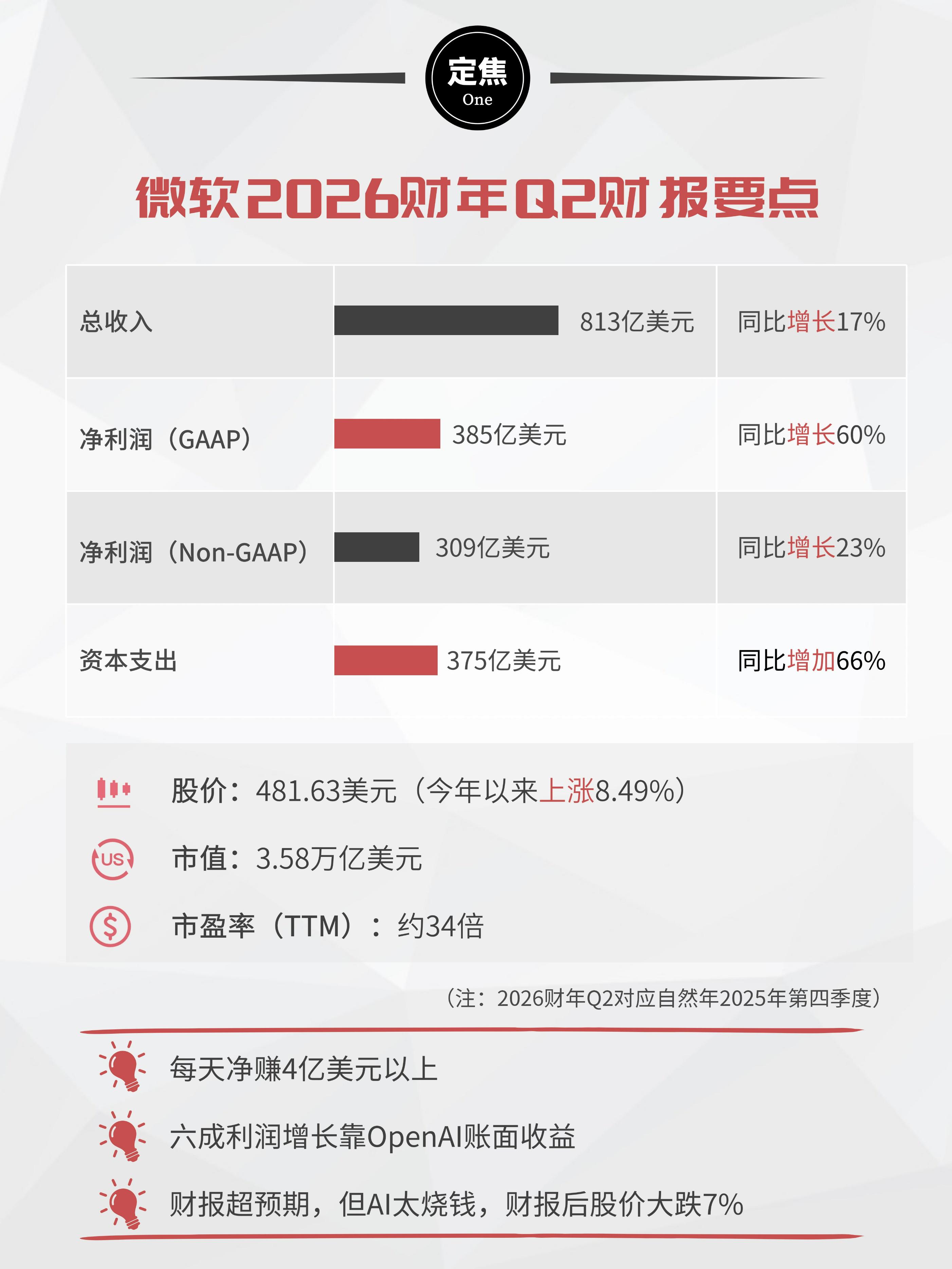 一方面,它靠AI疯狂“吸金”,总营收和净利润双双超出市场预期。总营收达到813亿美元,同比增长17%,按美国通用会计准则(GAAP)计算的净利润(385亿美元)更是飙升60%。