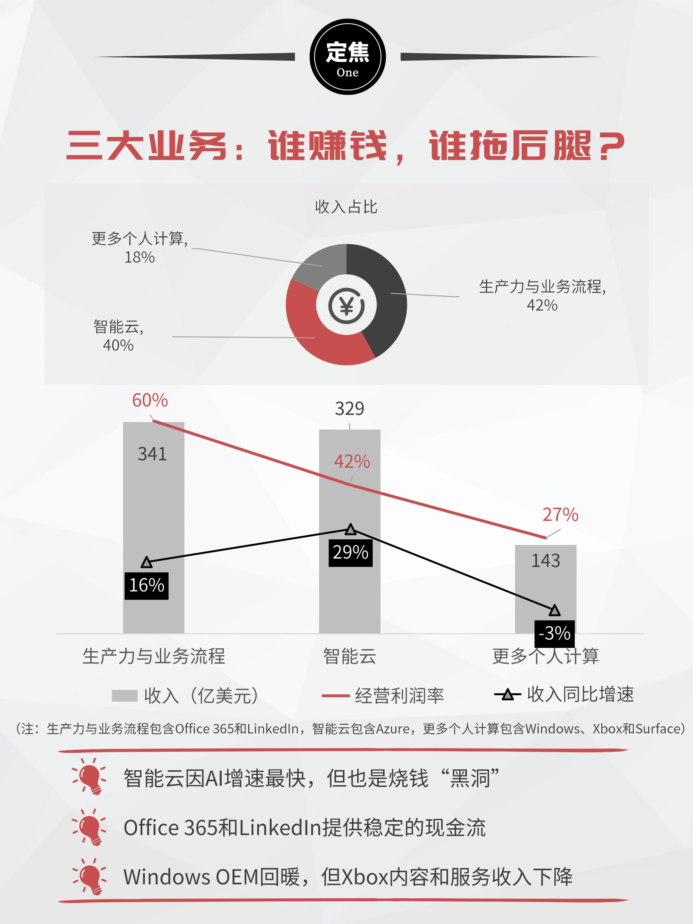 而包含Windows和Xbox的“更多个人计算”业务则表现疲软,成为唯一拖后腿的板块。