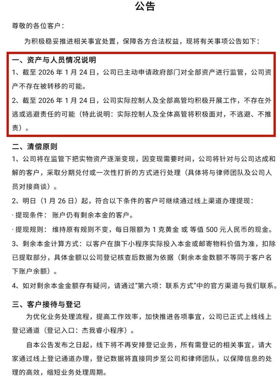 根据该公告,杰我睿依然将每日提现额度统一限制为1克黄金或500元现金。