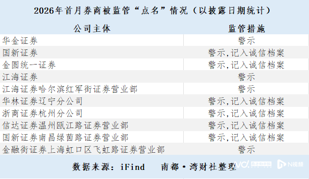 湾财社通过iFind数据平台整理发现,以披露日期统计,2026年开年以来,一共有8家券商被证监会以及地方证监局点名10次。