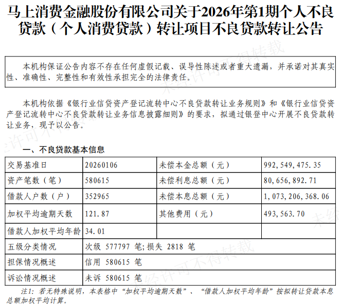 1月27日,马上消费金融通过银登网发布“2026年第1期个人不良贷款(个人消费贷款)转让项目不良贷款转让公告”。公告显示,该资产包未偿本息总额约为10.73亿元,资产笔数超过 58万笔,均为信用贷且均未发起诉讼。