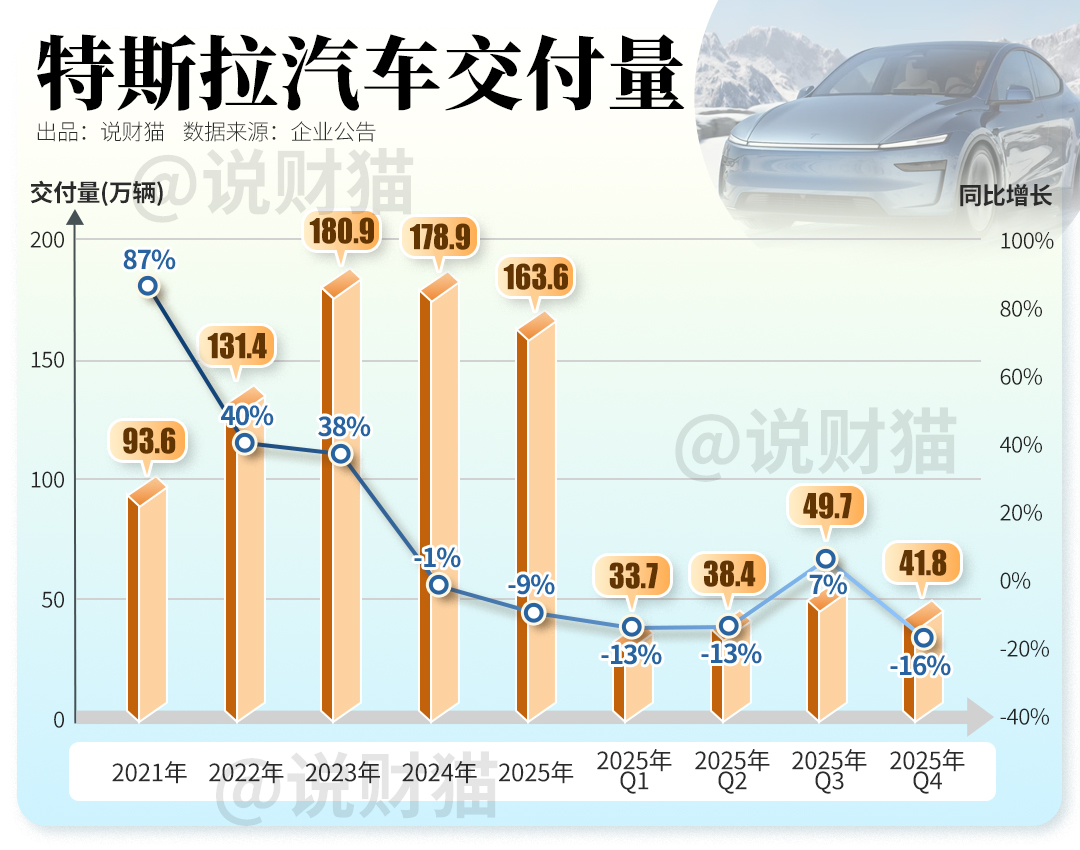 2025年特斯拉全球交付163.6万辆电动车,连续第二年出现下滑;