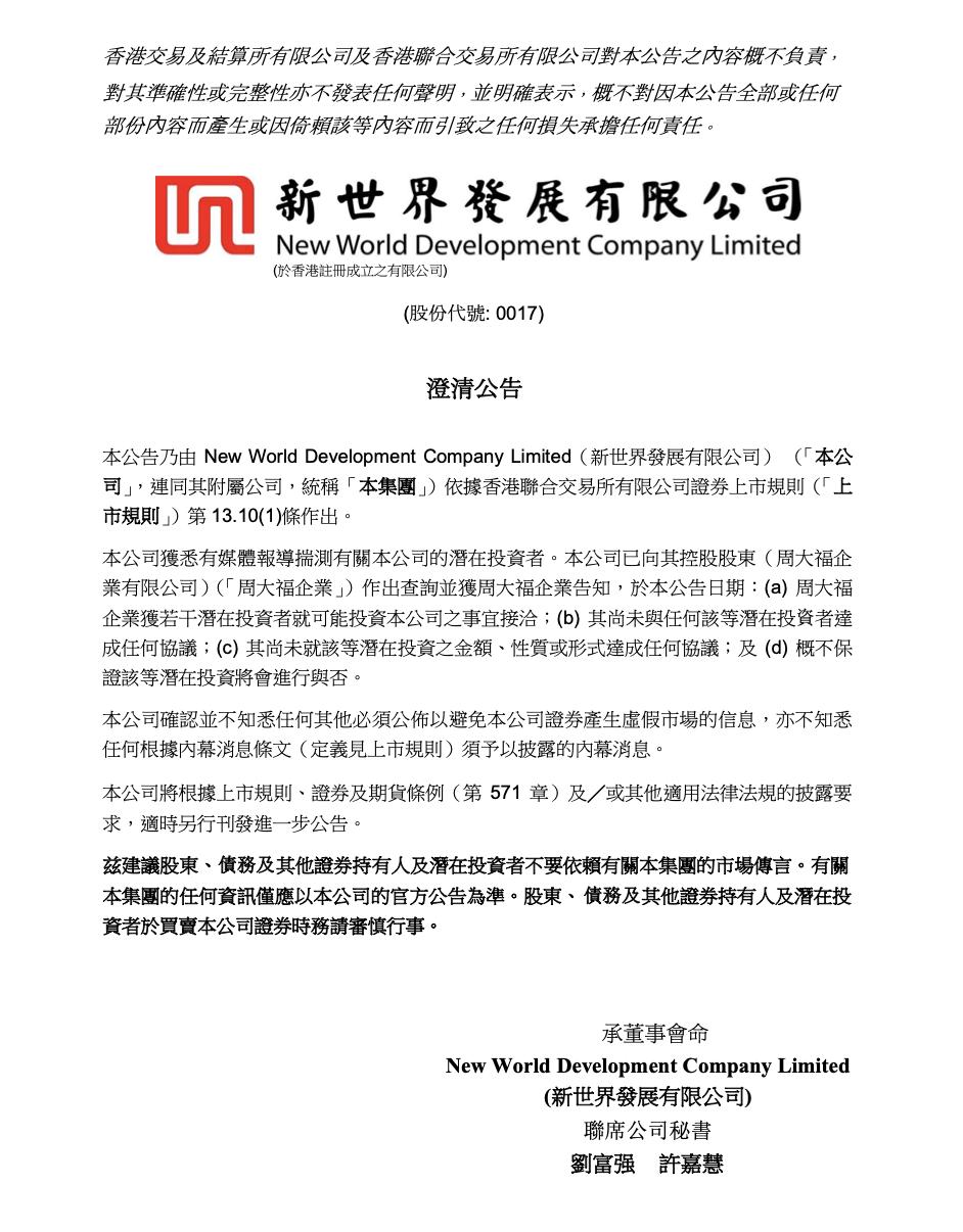 当日晚间,新世界发展发布公告称:“本公司获悉有媒体报导揣测有关本公司的潜在投资者。本公司已向其控股股东(周大福企业有限公司)(下称“周大福企业”)作出查询并获周大福企业告知,于本公告日期:(a) 周大福企业获若干潜在投资者就可能投资本公司之事宜接洽;(b) 其尚未与任何该等潜在投资者达成任何协议;(c) 其尚未就该等潜在投资之金额、性质或形式达成任何协议;及 (d) 概不保证该等潜在投资将会进行与否。
