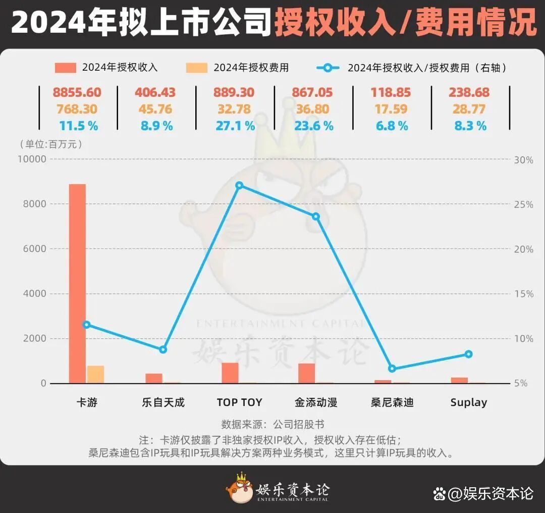 《娱乐资本论》曾整合上述6家潮玩公司的招股书数据,对比2024年授权IP产品收入与授权费用的比值。结果显示,卡游以11.5%领先,而桑尼森迪仅为6.8%,处于末位。这个比值越高,意味着公司对IP的运营和变现能力越强,反之越弱。
