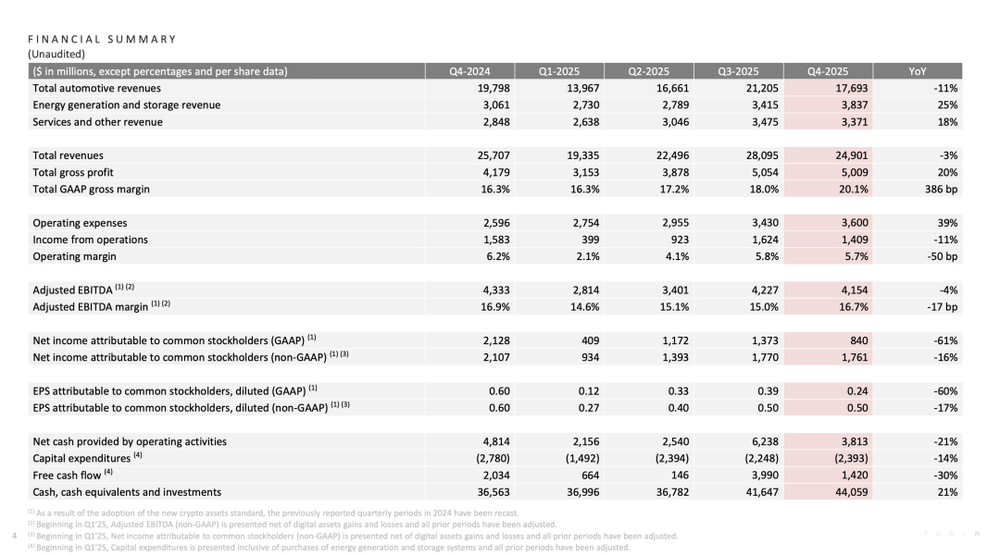 今日(1 月 29 日)凌晨,特斯拉对外公布 2025 年第四季度及全年财报。财报显示,当季特斯拉营收 249 亿美元,同比下降 3%,全年营收 948 亿美元,同比下降 3%。这是特斯拉成立以来首次年营收下滑。