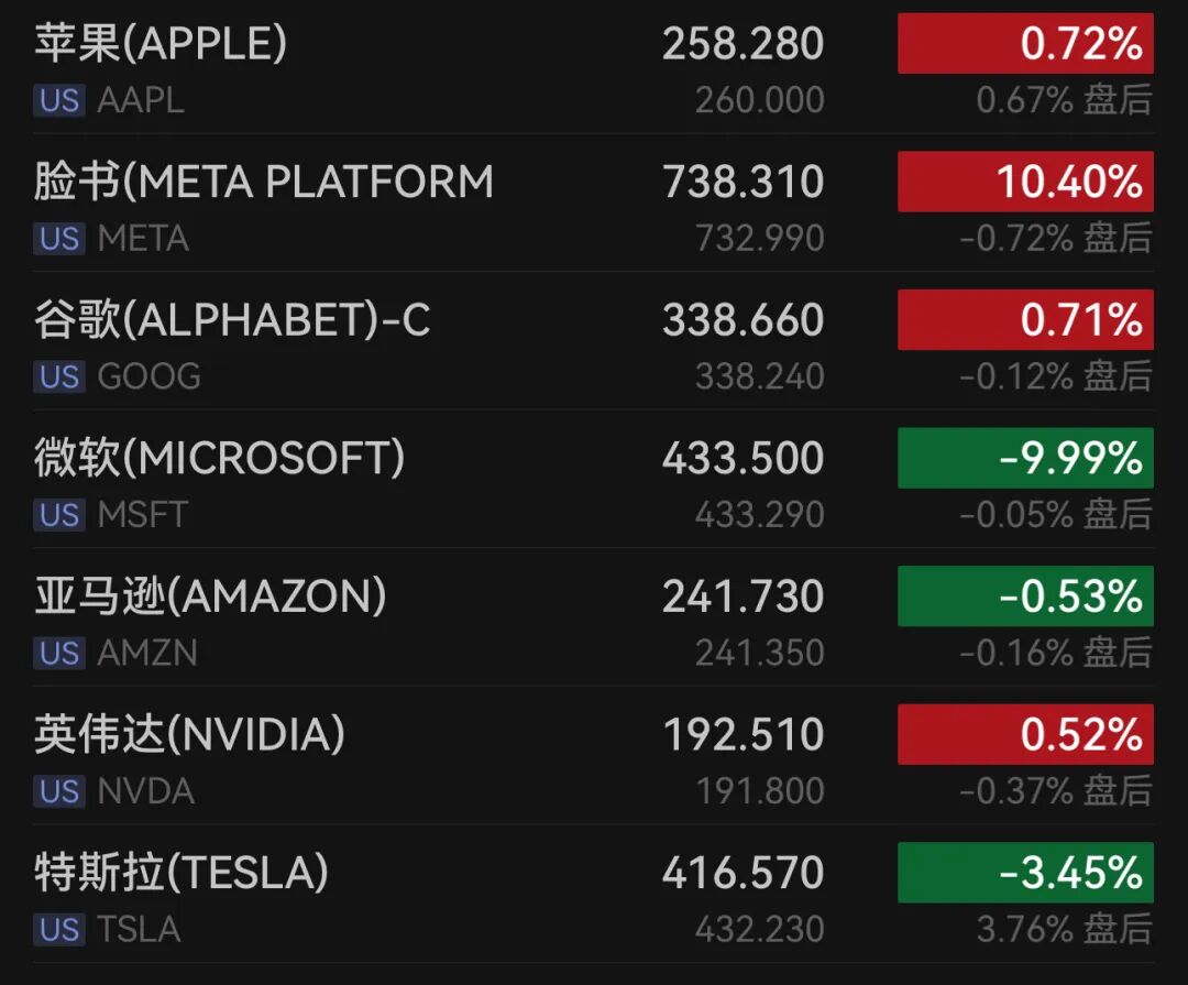 这一下跌盖过了Meta公布强劲季度业绩后的大涨表现。Meta股价当日上涨10.4%。特斯拉在公布财报后下跌3.5%。