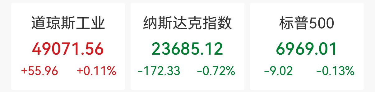 截至收盘,道琼斯工业指数涨0.11%,纳斯达克指数跌0.72%,标普500指数跌0.13%。