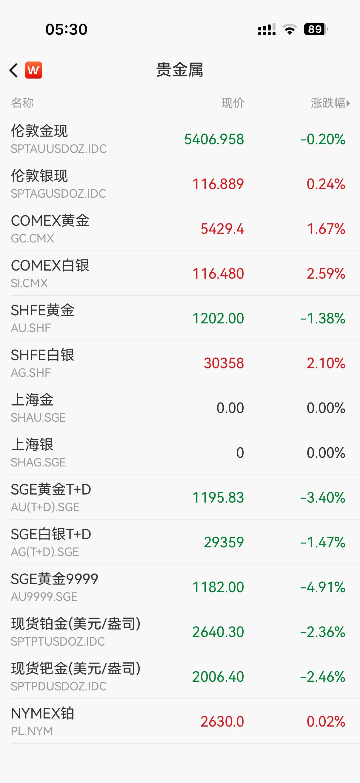 贵金属价格深夜大幅波动,现货黄金一度跌超5%,现货白银一度跌超8%。截至发稿,伦敦金现跌0.20%报5406.958美元/盎司,伦敦银现涨0.24%报116.889美元/盎司,COMEX 黄金涨1.67%报5429.4美元/盎司,COMEX 白银涨2.59%报116.48美元/盎司,现货铂金跌2.36%报2640.30美元/盎司,现货钯金跌2.46%报2006.40美元/盎司。