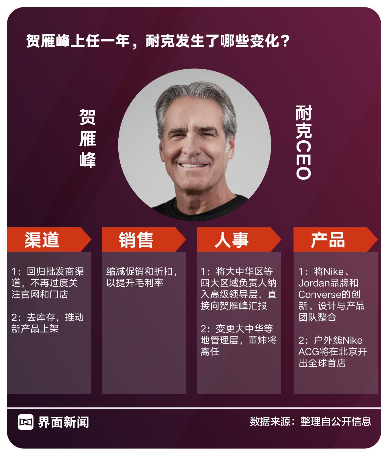 2024年10月,已到退休年龄的贺雁峰重返耐克。产品、渠道问题带来的业绩和股价下滑,让不少关注者忧心忡忡。许多人对贺雁峰寄予“救火”的厚望。