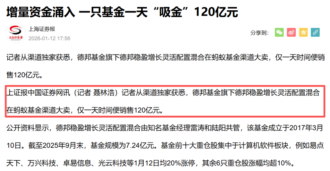 就在市场情绪最亢奋之际,1月12日,《上海证券报》报道称,该基金在蚂蚁基金渠道大卖,仅一天时间便销售120亿元。